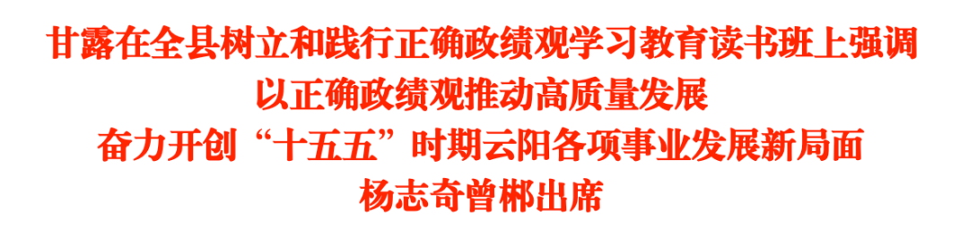 4月16日,云阳县树立和践行正确政绩观学习教育读书班举行辅导报告会。县委副书记、县政府县长甘露出席并作辅导报告。他强调,要全面学习领会习近平总书记关于树立和践行正确政绩观的重要论述,牢牢把握“立党为公、为民造福、科学决策、真抓实干”总要求,深化落实习近平总书记视察重庆重要讲话重要指示精神,深谋实干、唯实争先,努力创造经得起历史、实践和人民检验的实绩,奋力开创“十五五”时期云阳各项事业发展新局面。