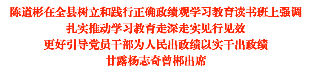 4月16日上午,云阳县树立和践行正确政绩观学习教育读书班举行辅导报告会。县委书记陈道彬出席并作辅导报告。他强调,要深入学习贯彻习近平总书记关于树立和践行正确政绩观的重要论述,牢牢把握“立党为公、为民造福、科学决策、真抓实干”总要求,扎实推动学习教育走深走实、见行见效,更好引导党员干部自觉为人民出政绩、以实干出政绩,为奋力谱写中国式现代化重庆篇章贡献更大力量。