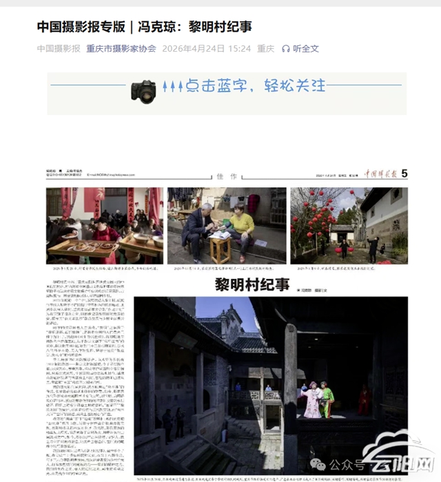云阳网讯(记者 李旭忠)4月24日,云阳籍摄影家、重庆市摄影家协会会员冯克琼历时三年多创作的配文摄影组照《黎明村纪事》,被《中国摄影报》“佳作”栏目整版刊载。这组作品以极具人文温度的镜头与扎实的田野调查,向全国读者呈现了云阳县凤鸣镇黎明村的古韵风貌与时代新生。