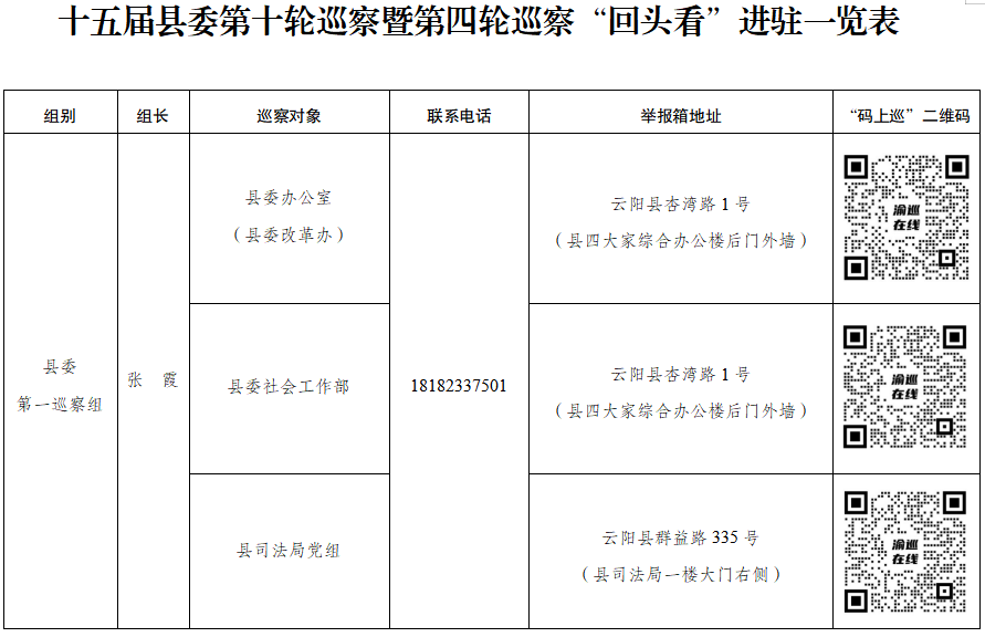近日,经县委批准,云阳县启动十五届县委第十轮巡察暨第四轮巡察“回头看”。本轮巡察共组建6个巡察组,对县委办公室(县委改革办)、县人大常委会机关党组等8个县管党组织开展常规巡察;对农村集体“三资”管理、医保基金管理、养老服务、高标准农田建设突出问题等4个群众身边不正之风和腐败问题专项整治项目开展专项巡察;对县司法局党组、县住房城乡建委党委、工业园区党工委和龙角镇、蔈草镇、龙洞镇等3个乡镇所属村(社区)党组织开展巡察“回头看”,现场巡察时间为3个半月左右。