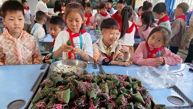 6月5日,盘石小学邀请家长志愿者们走进课堂,与学生们一起开展了“粽情端午 金色童年”包粽子劳动实践活动,共迎端午佳节。