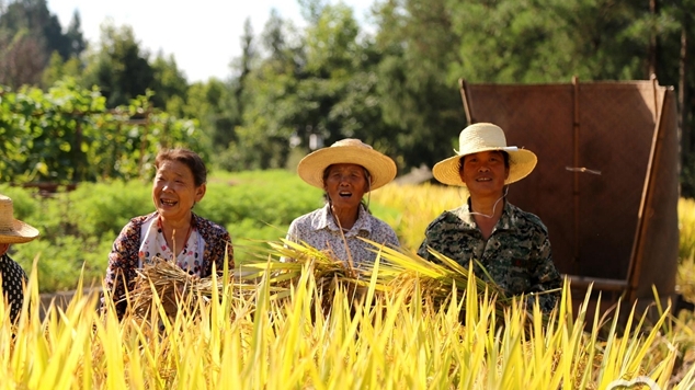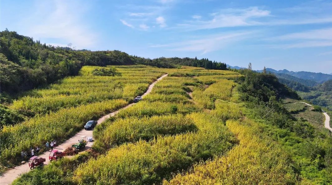 近日,凤鸣镇黎明古村的五彩水稻迎来丰收,连绵的稻田与老屋连为一体,满眼尽是“喜看稻菽千重浪”的醉人景象。