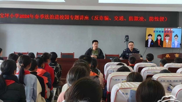 3月27日下午,宝坪小学特邀宝坪派出所负责人、学校法治副校长为该校师生作“以‘法’为名、护我前行”主题法治讲座。