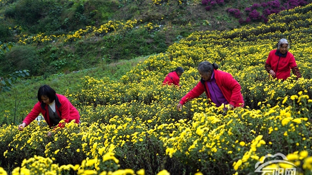 近日,三峡渝菊千亩菊花种植基地陆续进入收获期,花农们正趁着晴好天气,忙碌地采摘菊花,田间地头一派繁忙景象。