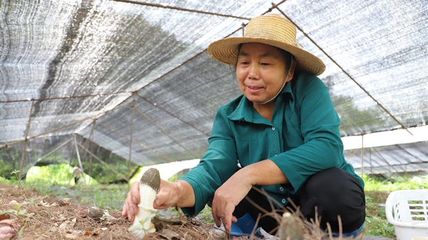 连日来,木南村的三十多亩红托竹荪迎来采收旺季。大棚内、林荫下,一朵朵形似纱裙、色泽洁白的竹荪破土而出,三四十名本村村民正忙着采摘、分拣。这片生机勃勃的景象,源于村集体年初的主动谋划。