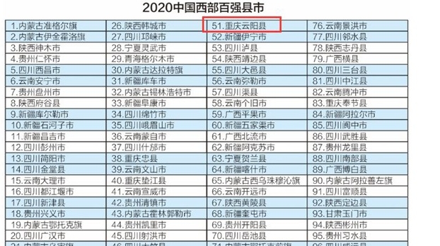 “2020中国西部百强县市”名单出炉 云阳连续三年上榜