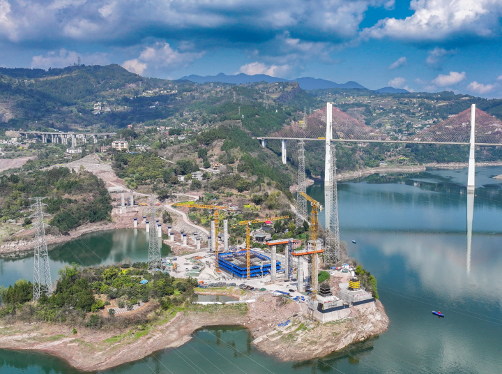近段时间,在云阳县国道G348陈家溪至万州界段公路改建工程一期双江二桥建设工地,建设者正在加紧施工。