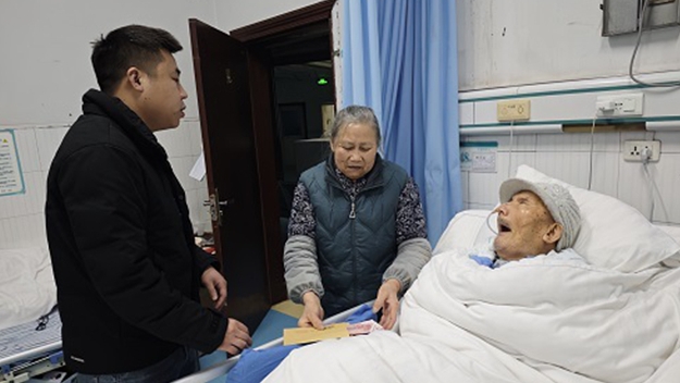 近日,江口镇退役军人服务站工作人员前往医院,为91岁患病住院退役军人送去慰问金,将党和政府的关怀与温暖精准送达病房。