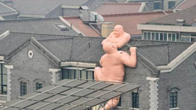 1月19日,两尊“裸佛攀房”艺术雕塑亮相济南,“小沙弥”憨态可掬的攀房造型吸引不少路人观看。图为双手合十“裸佛”召唤“小沙弥”攀房。中新社发 张勇 摄[详细]