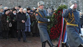 • 普京单膝跪地献花 纪念列宁格勒保卫战胜利70周年