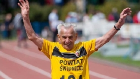 科瓦尔斯基穿上印有他的年龄“104”的黄色T恤,完成了在弗罗茨瓦夫运动场举行的青年奥林匹克比赛。[详细]