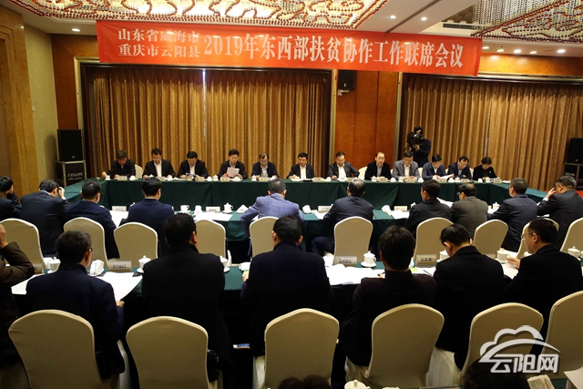 联席会上,王鲁明对云阳近年来经济社会发展、脱贫攻坚等工作给予高度评价。他说,开展东西部扶贫协作是党中央、国务院推动区域协调发展、协同发展、共同发展的重大国家战略,是打赢脱贫攻坚战的有效手段。多年来,威海与云阳合作交流亲如一家,团结协作,共同发展两地经济,优势互补,相互帮助,大家结下了深厚的友谊。面对脱贫攻坚目标任务,深切感受到责任使命重大。他表示,威海将和云阳干部群众一起同心协力,共同把东西协作做得更好,更实,更多。根据云阳实际需求,在农产品销售、大旅游、大健康、招商引资、企业合作、人才培养、干部交流、结对帮扶等方面加大支持力度,找准对接口,有针对性地开展工作,共同实施协作项目,发挥援助资金最大作用,不断推动区市、部门、企业、社会层面互动更加有效。进一步密切交流,紧密合作,携手并肩共同做好云阳和威海的东西部扶贫协作工作,共同打好打赢脱贫攻坚战,促进两地共同高质量发展,造福两地人民。