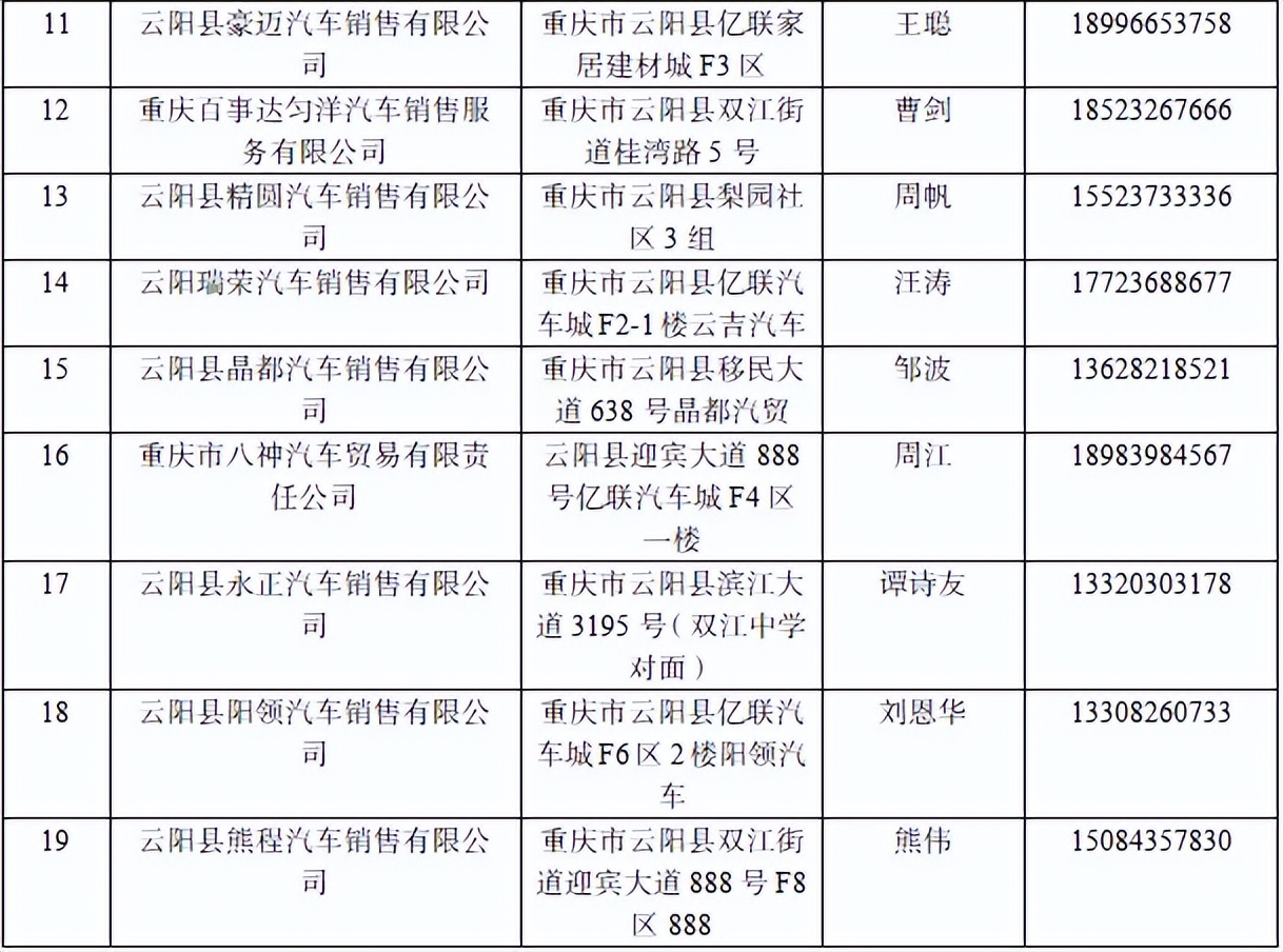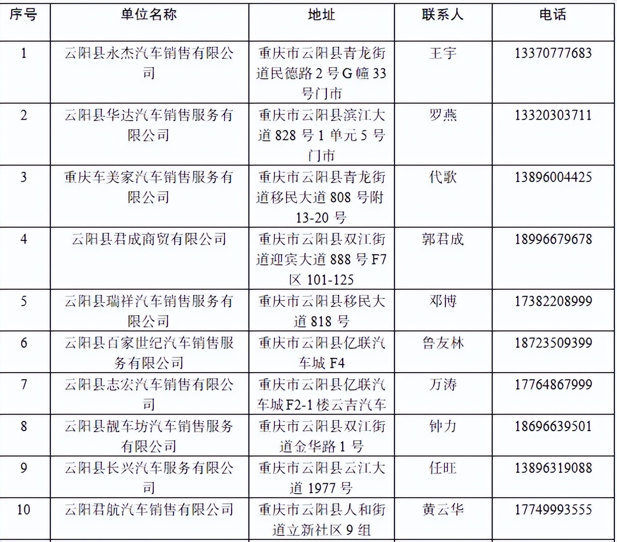 云阳县实施2024年汽车以旧换新补贴政策单位名单