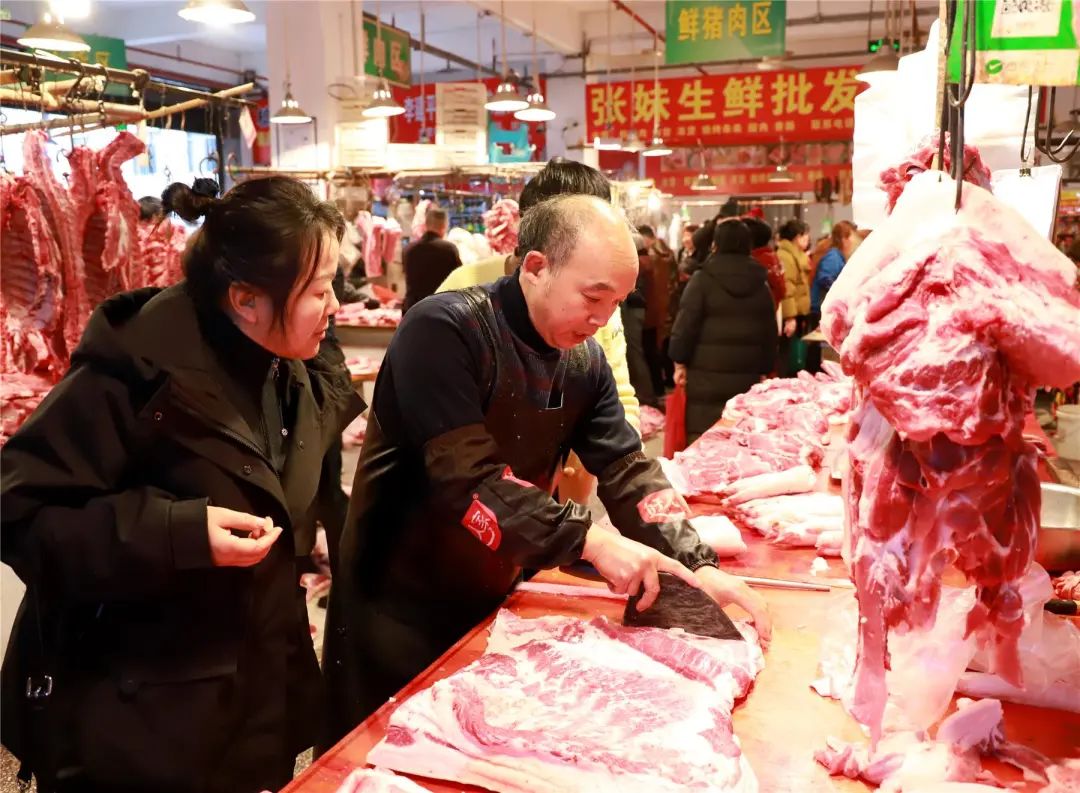 他们精心挑选着新鲜的猪肉