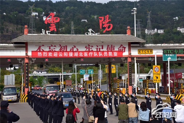 当天下午16时27分,载着12名“白衣战士”的大巴车准点到达沪蓉高速云阳收费站出口。早已在高速出站口处列队等候的公安干警齐刷刷地向医疗队员敬礼致敬,用最崇高、最真诚的敬意,迎接援鄂的12名战“疫”英雄凯旋。