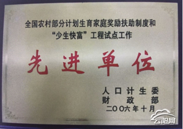 2006年云阳县被国家人口计生委、财政部授予“全国农村部分计划生育家庭奖励扶助制度和少生快富工程试点工作先进县”称号