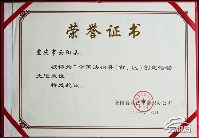2018年云阳县被全国普法办表彰为“全国法治县创建先进单位”。