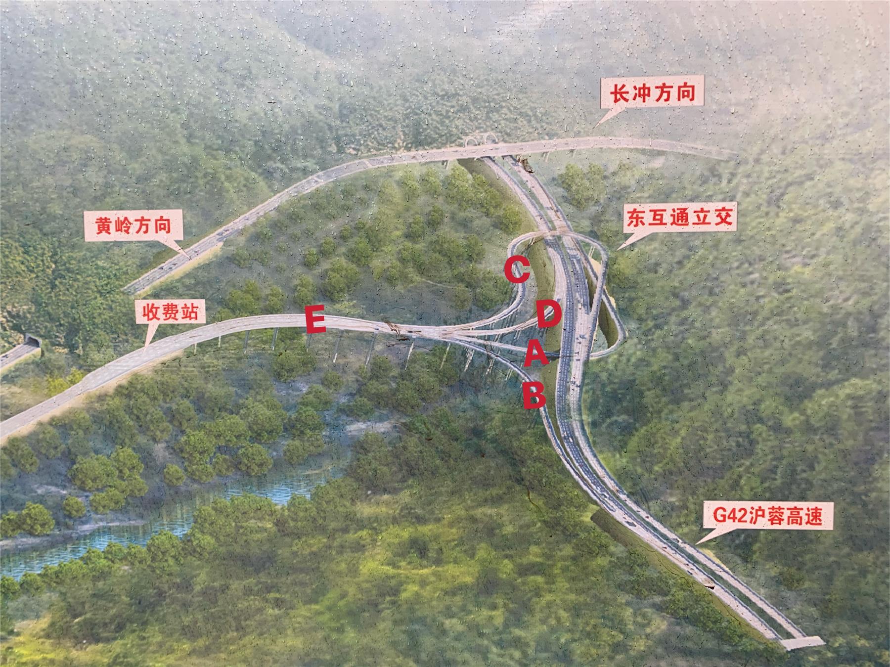 东互通立交工程项目地处铁峰山至大松树山之间,是G42沪蓉高速公路的一条新连接线,全长2441米,主线整体式路基宽度24.5米,新建桥梁5座,总长1117.4米,包括A、B、C、D、E五个匝道和加宽道,另有防护工程、涵洞工程等构造物工程。