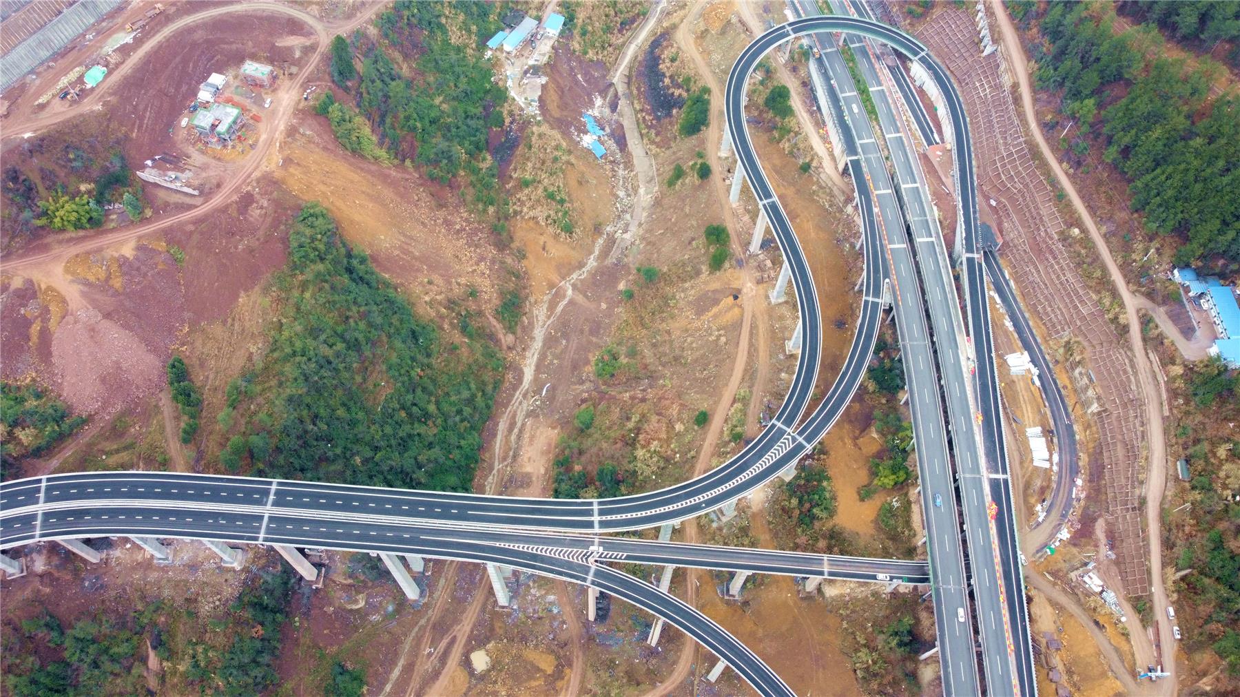 1月26日,记者在东互通立交施工现场看到,主体完工的东互通立交几条匝道向四周舒展开来,犹如从沪蓉高速公路旁绽放出一朵喇叭花。施工现场负责人介绍,目前正在进行最后一小段匝道的防撞栏安装以及小部分格子梁的收尾施工,五条匝道全部具备通车条件。剩余的机电、交安、房建等附属工程正在加紧推进当中。
