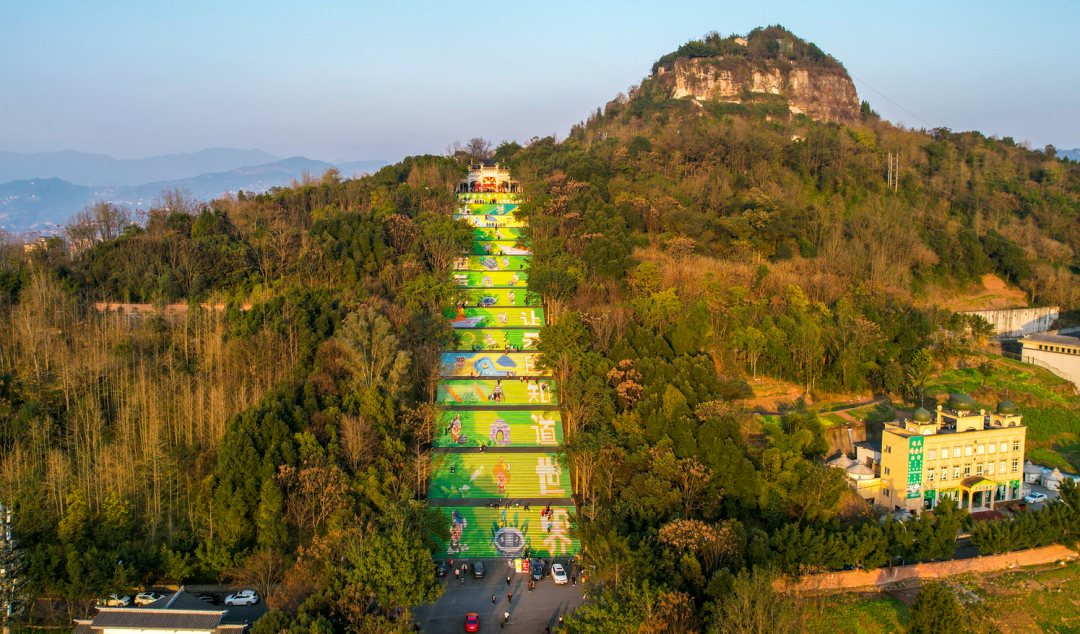 登云梯上1600多平方米城市形象IP“兴云兔”彩绘,更是让人耳目一新,吸引市民争先打卡。从空中俯瞰,环湖绿道8大主题公园,一一出现在登云梯上,云阳名人辛寅逊创作的我国历史上第一副春联也融入彩绘图案中。