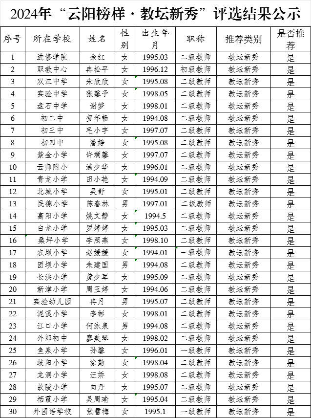 2.云阳县2024年度“云阳榜样·教坛新秀”30名;