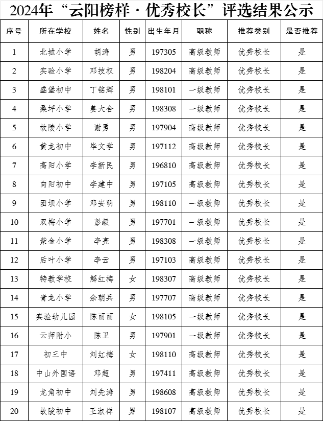 3.云阳县2024年度“云阳榜样·优秀校长”20名。