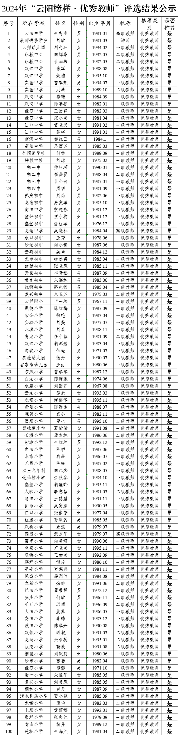 1.云阳县2024年度“云阳榜样·优秀教师”100名;