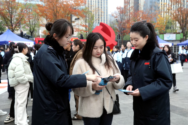 在云阳县新时代文明实践广场,税务人员向参加活动的企业人员讲解税费政策。唐金荣/摄