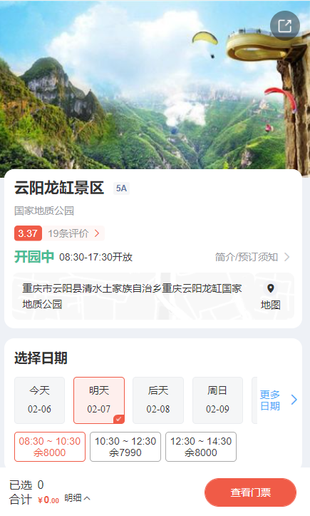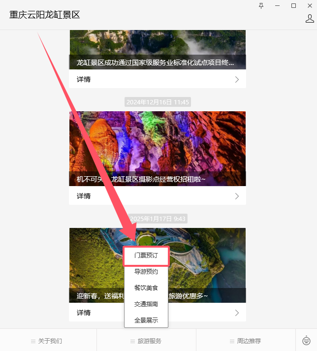 关注“重庆云阳龙缸景区”公众号,进入主页后,选择【旅游服务】→【门票预约】