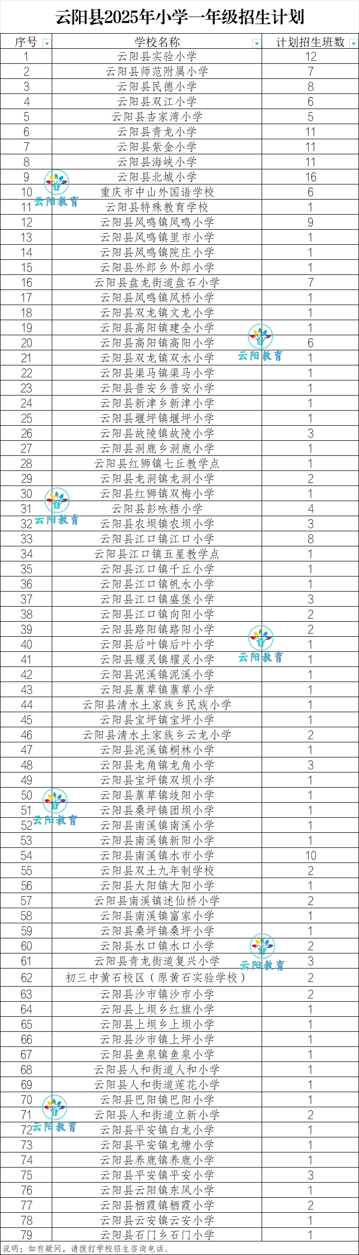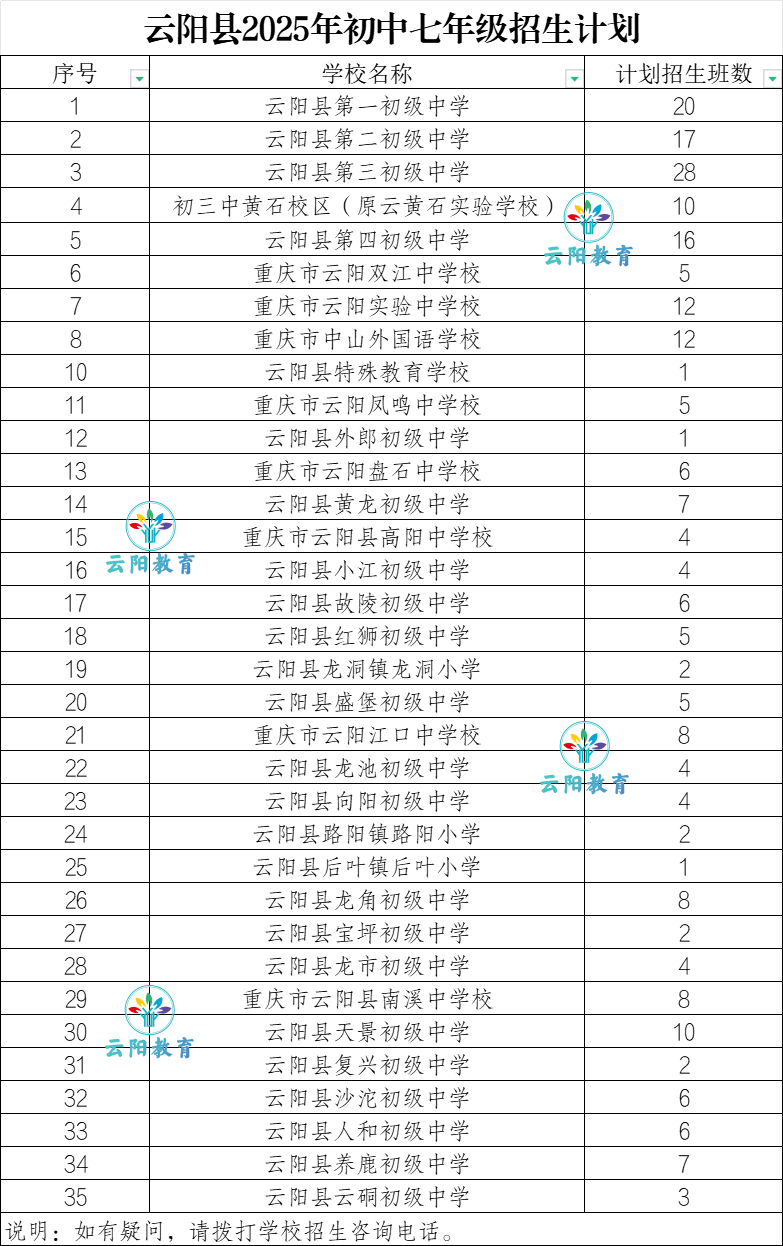云阳县2025年秋季义务教育学校